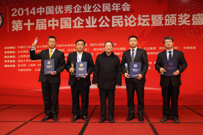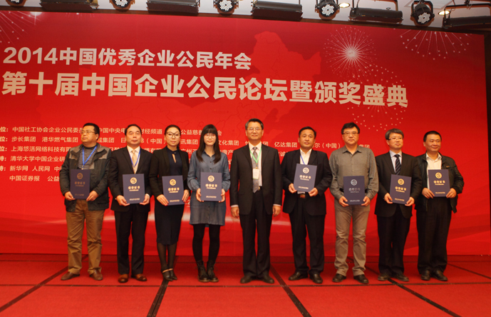 第十届“中国企业公民论坛暨中国优秀企业公民表彰大会”是由中央电视台财经频道、中国社会工作协会企业公民委员会、腾讯公益慈善基金会联合举办。通过历时近一年的企业填报信息、第三方信息核验、形象危机预警、专家综合评定等一系列严格的评选程序,分别从10个方面对被评选企业的经济责任、法律责任、伦理责任和社会责任进行了系统的检验和评价,最终评定2014年度“中国优秀企业公民”、“中国成长型企业公民”和“中国最具社会责任企业家”等奖项,共有87家企业、13名个人、17个优秀项目、9家单位受到表彰。