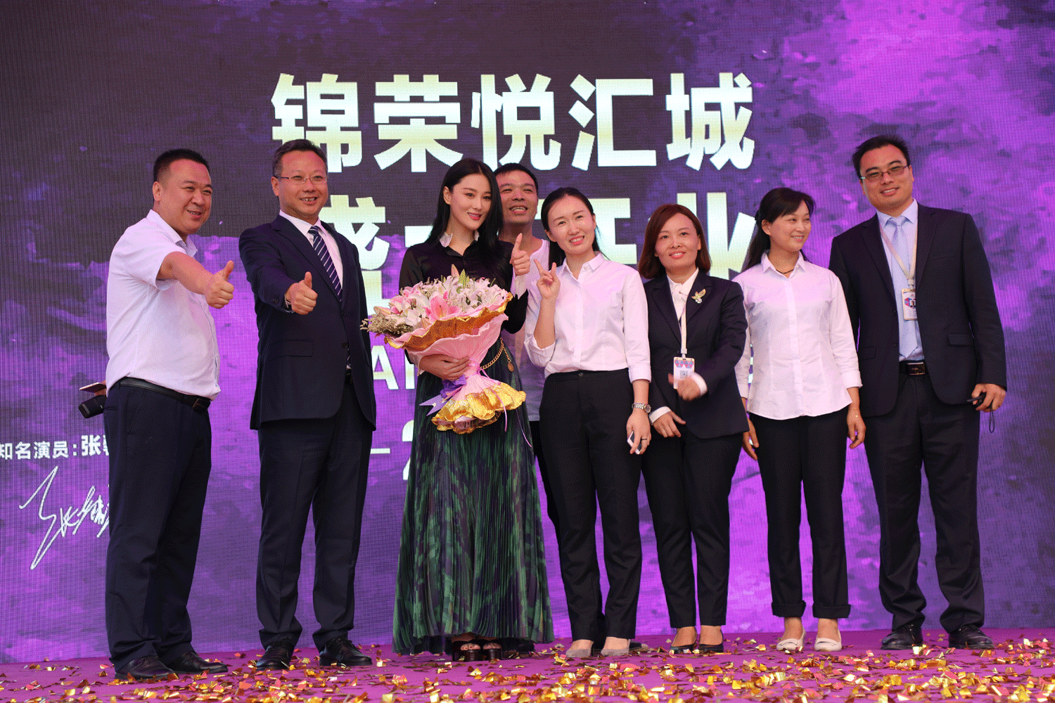 与会领导与嘉宾一同上台,共同为锦荣悦汇城开业剪彩。